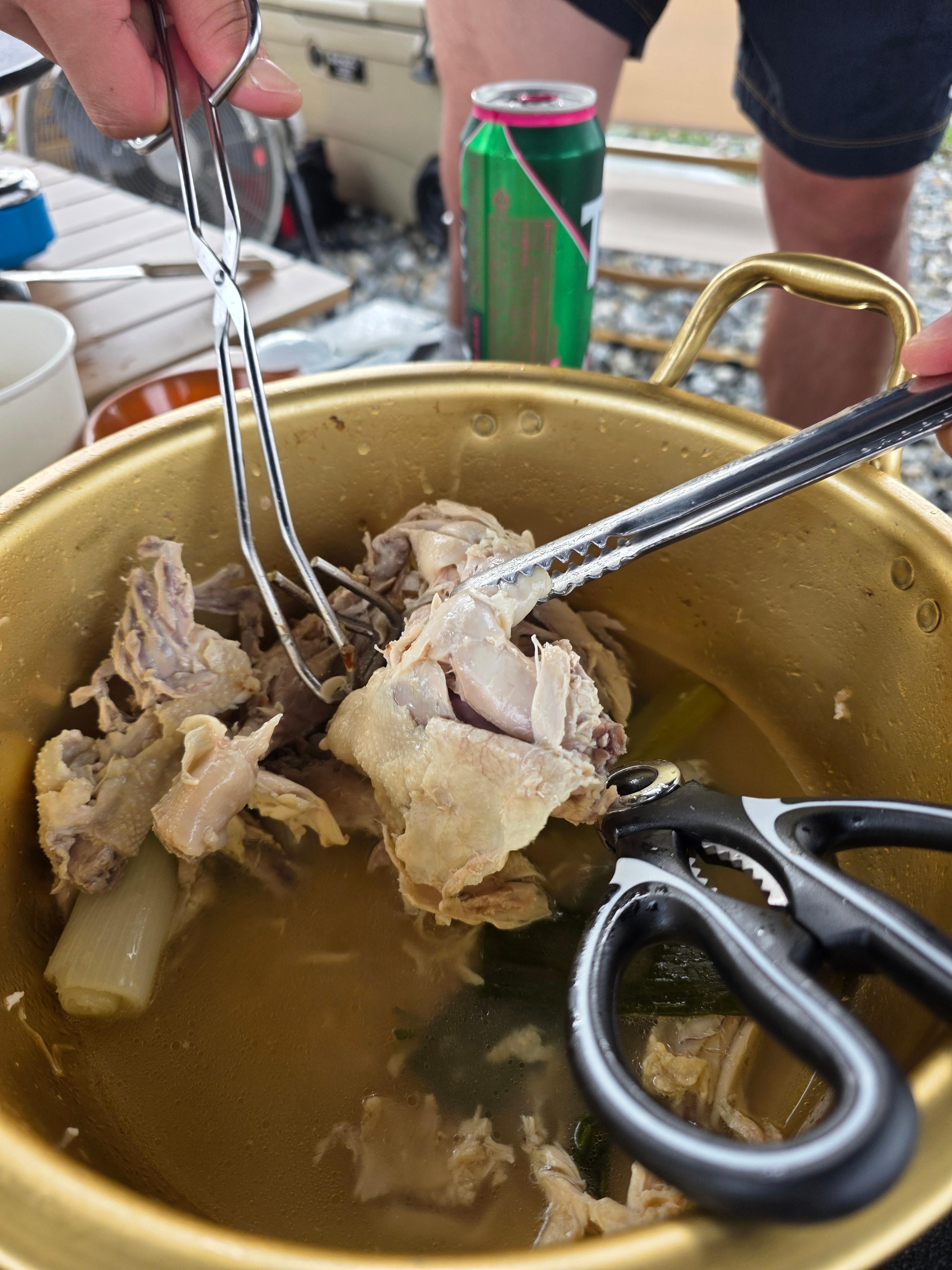 백숙 역시도 정말 인기가 많은 캠핑 음식 중 하나인데 캠핑장 근처에 마트를 가면 대부분 백숙용 닭과 같이 넣으면 구수해지는 한약재를 같이 구매해 팔팔 끓여 드시면 됩니다.
