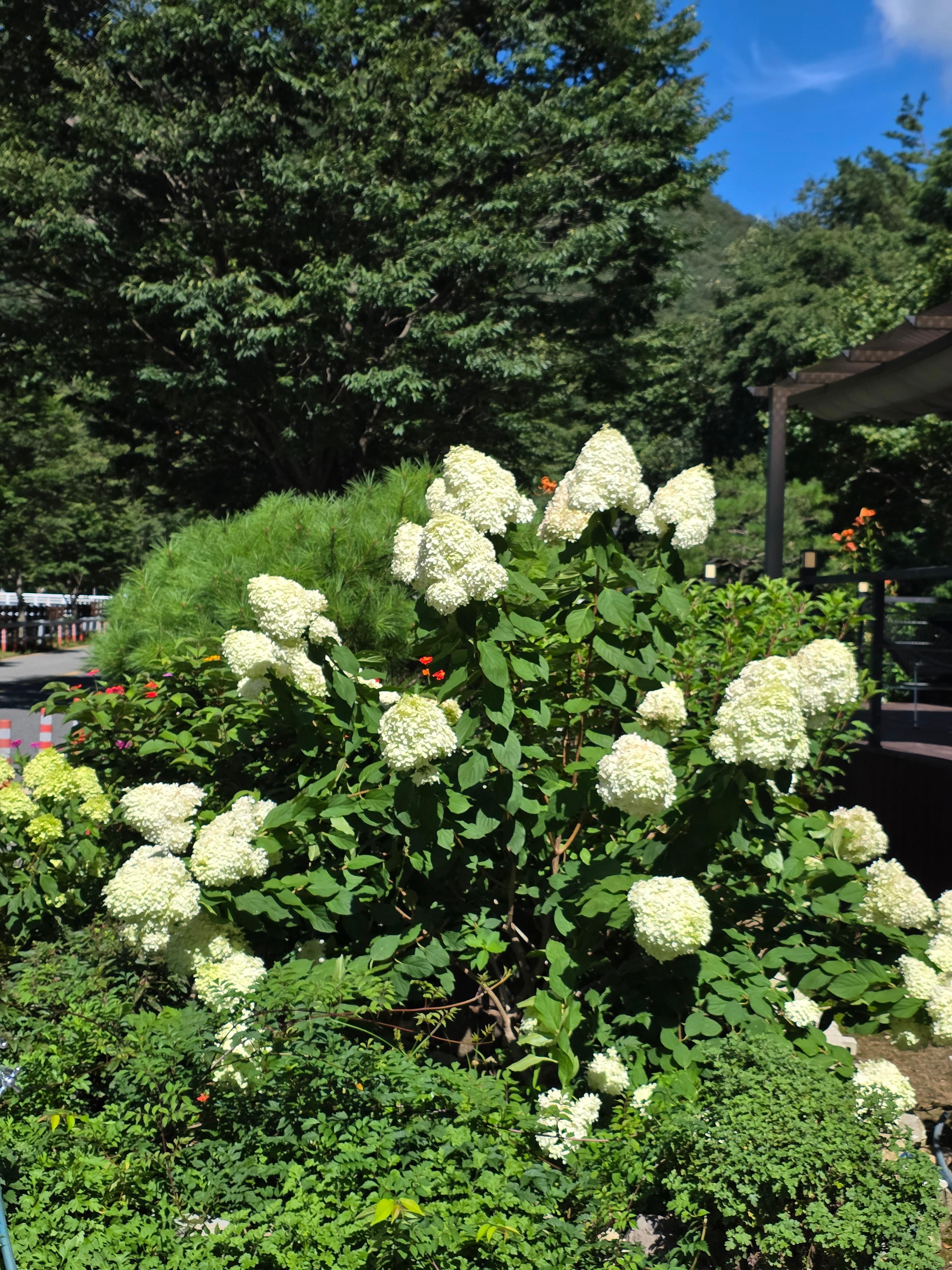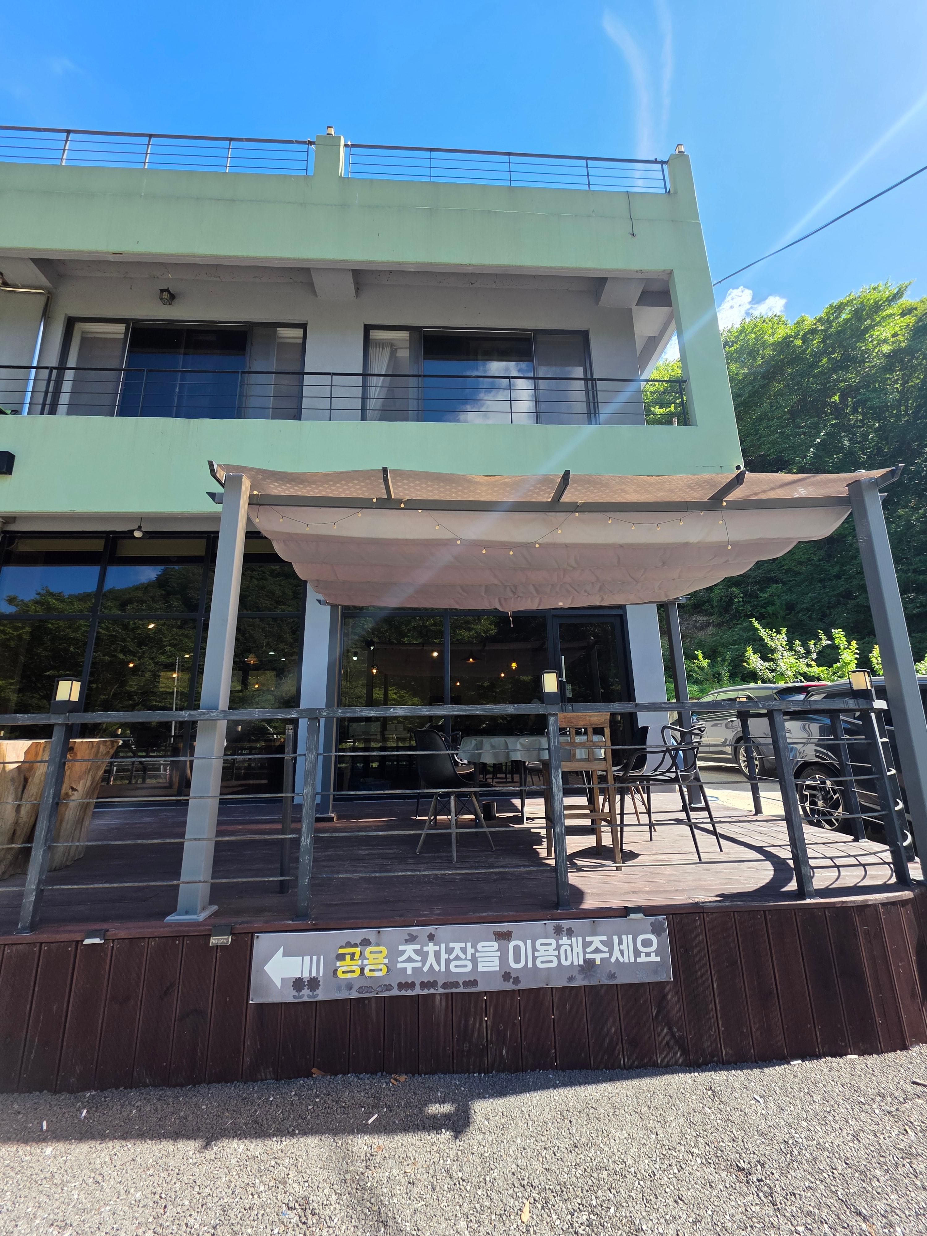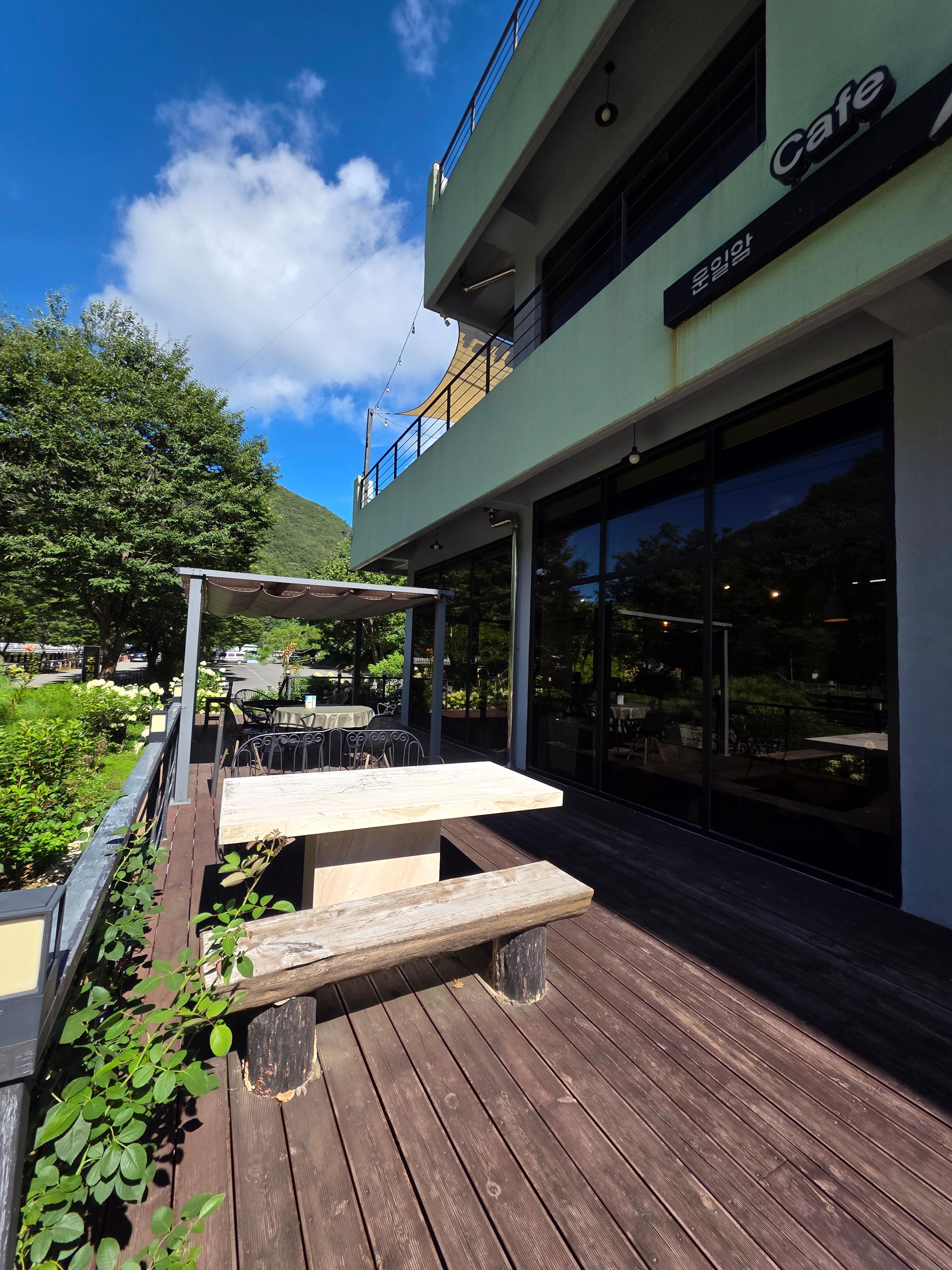 입구앞에는 작은 테라스가 있지만 사실 흡연을 하는 곳이라 테라스 이용은 좀 어려울 것 같아보이고 그래도 입구에 꽃도 펴있고 바로 맞은편에 멋진 운일암 절경을 또 함께 만나볼 수 있답니다.
