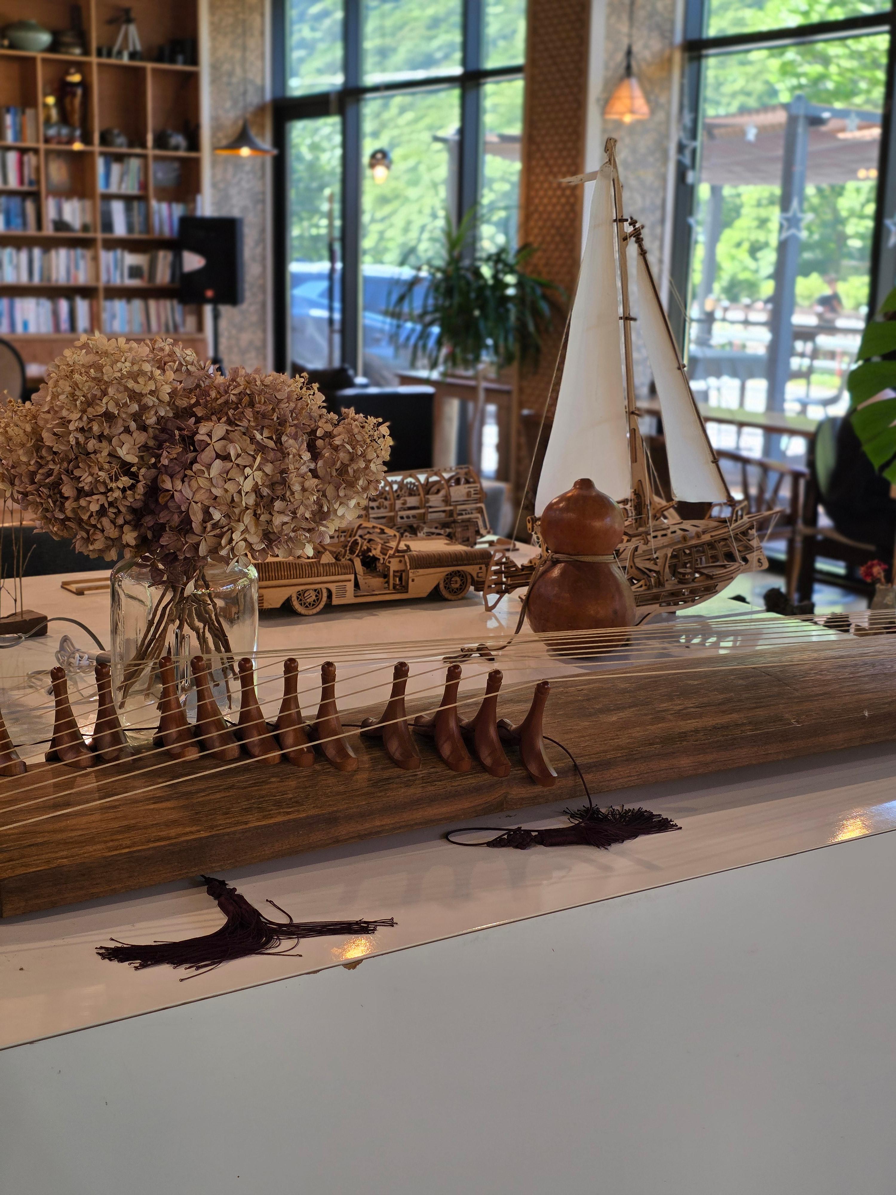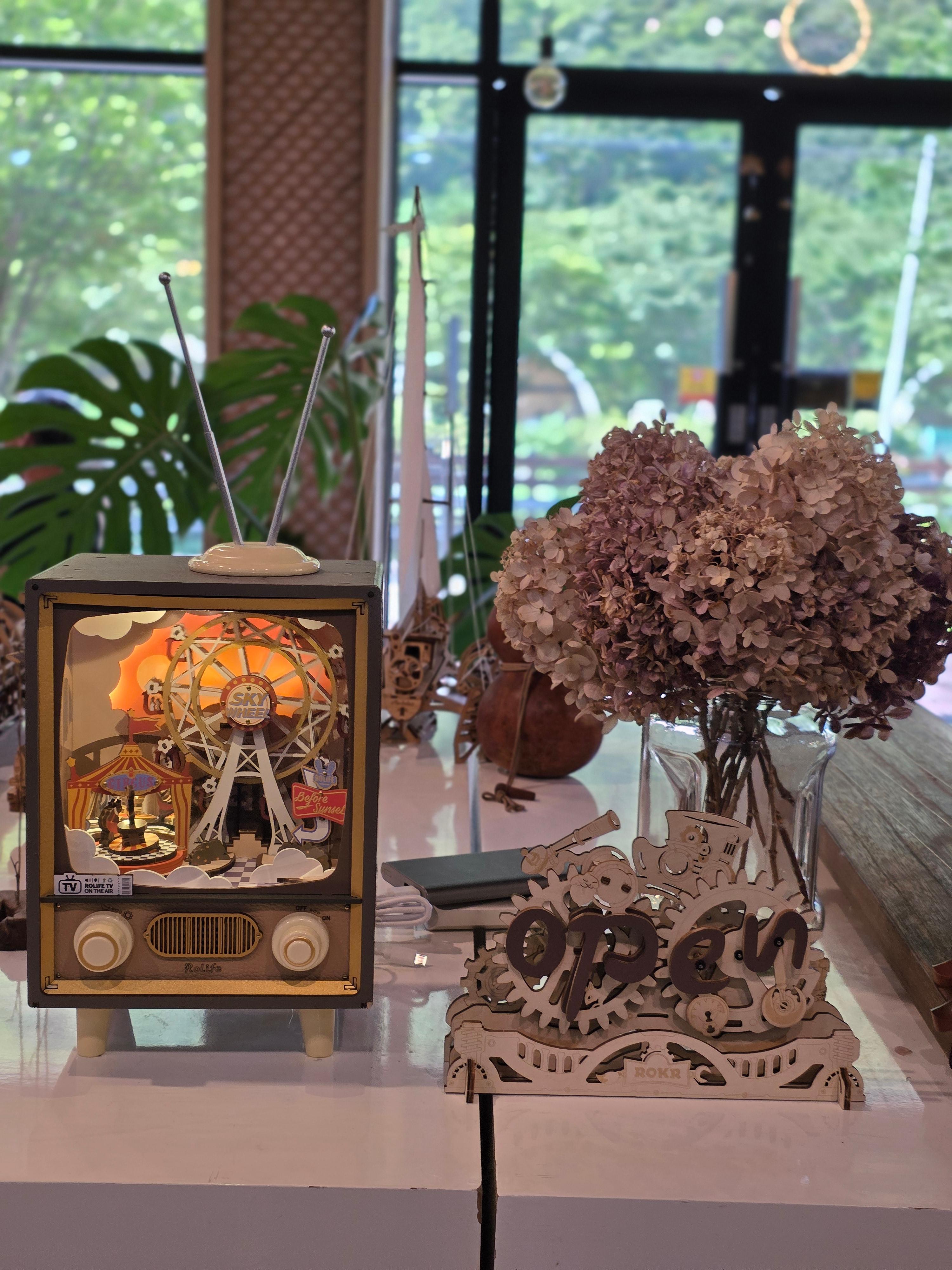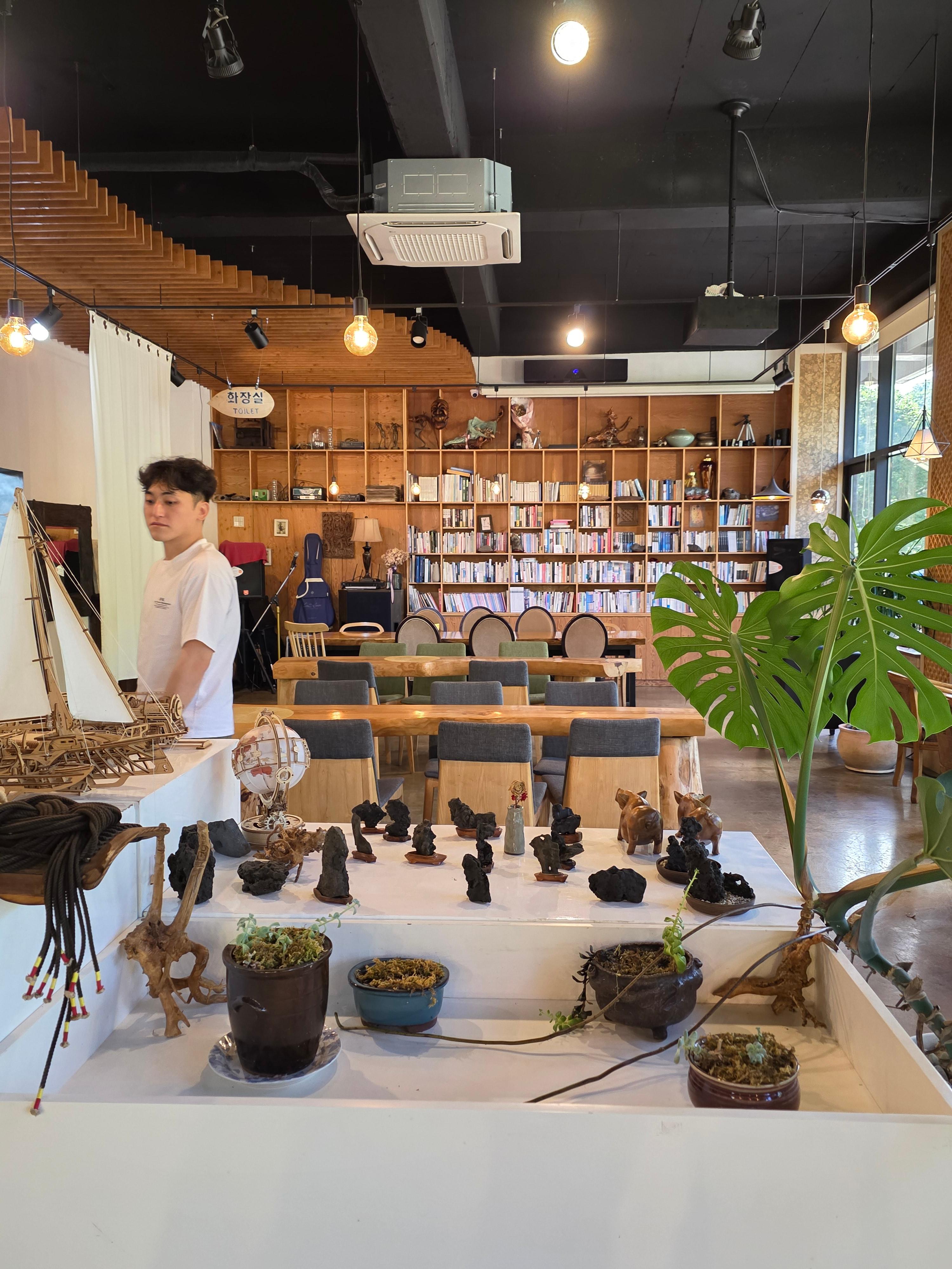입구에 들어서면 우드 톤으로 된 인테리어와 중앙에 여러 아기자기한 소품들과 식물들을 만나볼 수 있는데 사장님께서 돌리면 음악소리가 난다고 하시더라구요.