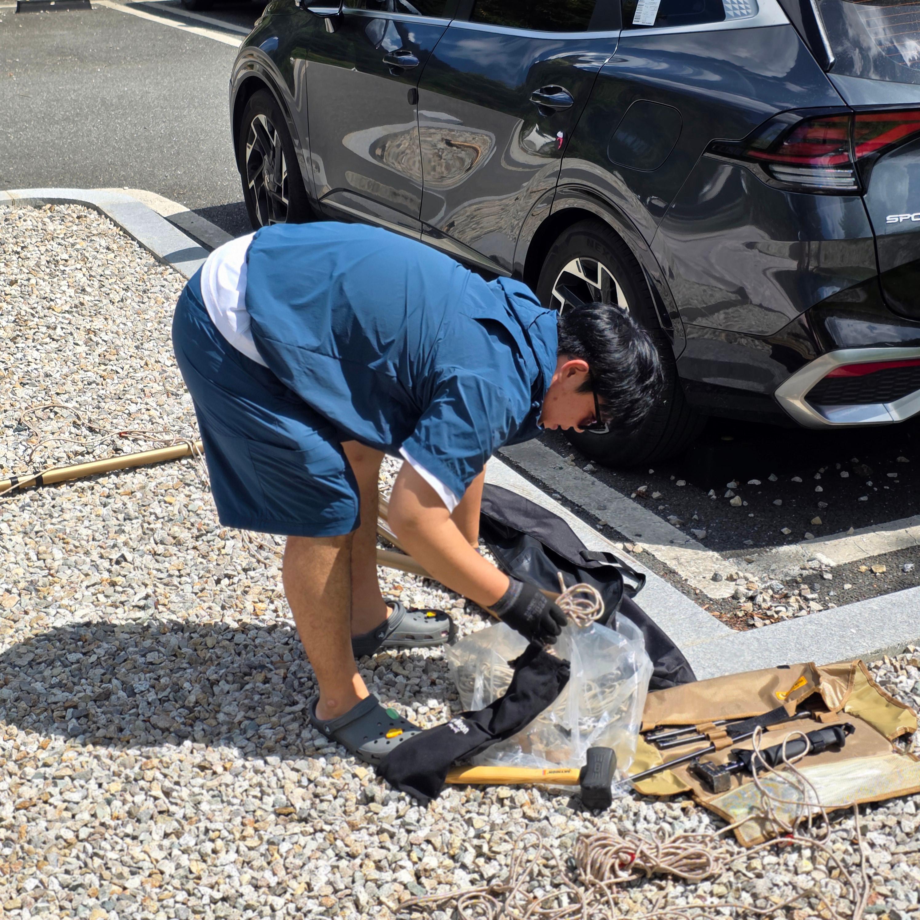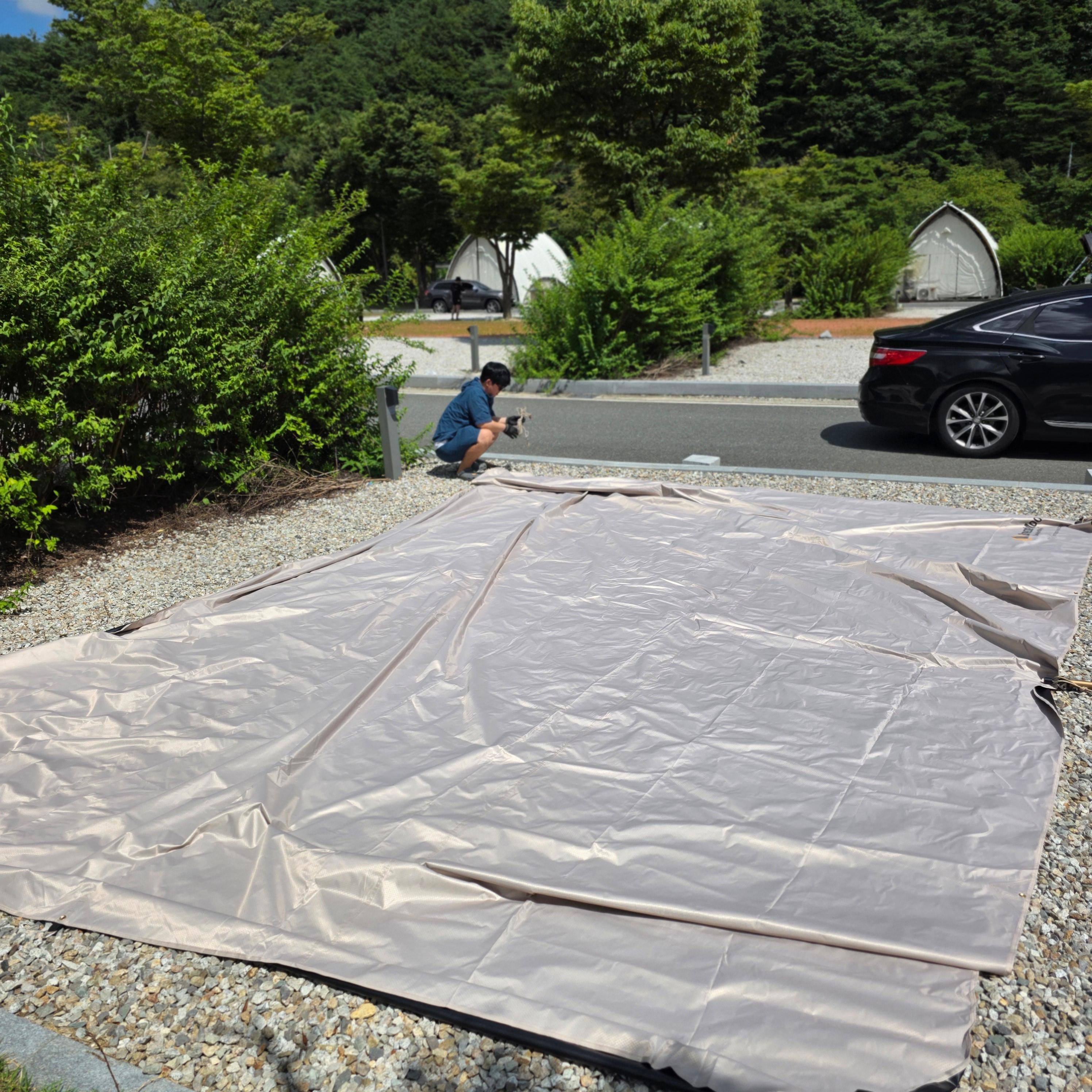 땀을 얼마나 흘렸는지 이게 사실 규격이 타프가 10m는 되야 좀 펼치기도 수월한 큰 규모의 타프인지라 다소 불편함도 있었고 규격이 안맞다는 건 타프를 펼쳐도 팽팽하게 잡아줄 수가 없다는 점이 매우 아쉬웠는데 없는 것보단 좋겠다 싶어서 그냥 막 설치를 해보았습니다.