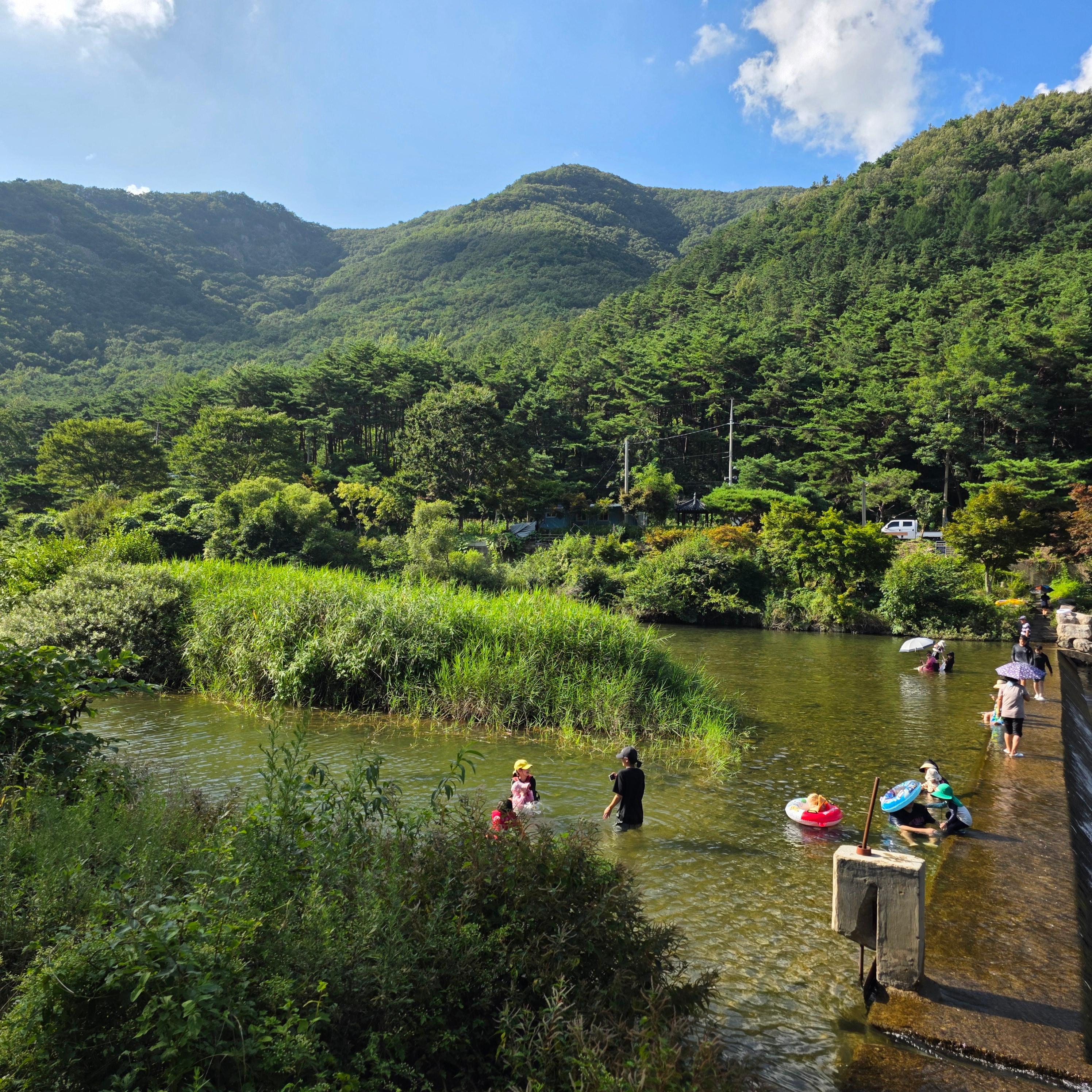 어린 아이들이 즐길 수 있는 수심이 앝은 곳에서는 다슬기를 채집하시는 분들도 많이 있었고 수심이 깊은 곳엔 튜브를 타고 들어가 물놀이를 즐기는 분들도 정말 많았습니다!